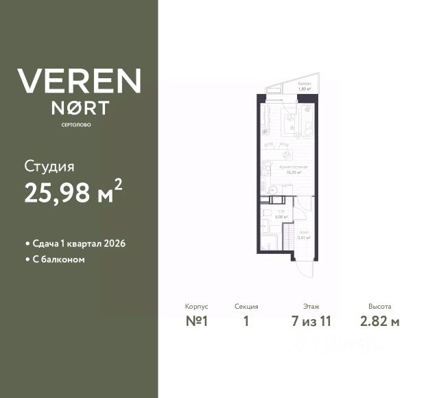 Студия на 7 этаже общей площадью 28,76 м² в IV очереди в жилом комплексе Сертолово Парк от застройщика ГК Алгоритм. Все квартиры в ЖК Сертолово Парк сдаются с чистовой отделкой в скандинавском стиле. Въезжайте и живите без дополнительных затрат на ремонт. Увеличенные оконные проемы и потолки высотой 2,74 м придают квартирам в ЖК Сертолово Парк ощущение простора, обеспечивая максимальное естественное освещение и свежий воздух. Энергосберегающий дом строится по финским технологиям: наружные стены изготовлены из заводских трехслойных железобетонных панелей толщиной 390 мм, фасады утеплены - толщина утеплителя 150 мм - и закрыты декоративным слоем -толщина 90 мм. Расположение ЖК: идеальное место для комфортной жизни в городе Сертолово. В 200 метрах находится детская и взрослая поликлиники. Вблизи детские сады и школы. ЖК Сертолово Парк окружен прекрасным лесным массивом, что создает уникальную атмосферу спокойствия и природной красоты прямо за порогом вашего дома. Для детей и взрослых на территории ЖК имеются детские и спортивные площадки. Кроме того, чтобы обеспечить безопасность и уединенность, территория жилого комплекса полностью закрыта. 4 закрытых многоуровневых наземных паркингов с грузовым лифтом на 1200 машин.