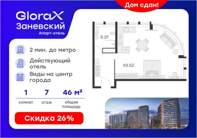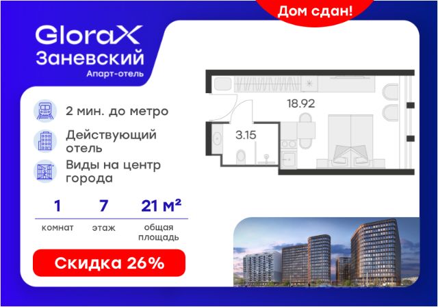 Продается апартамент-студия на 7-м этаже в сданном Апарт-комплексе бизнес-класса "GloraX Заневский". Ключи сразу! Общая площадь лота составляет 32,92 кв. м, из которых 23,72 кв. м отведено под жилую. Номер апартамента - 701. Преимущества: - Полная чистовая отделка - Возможность покупки меблировка и техника - Вход по ключ-карте - Прачечная на 1 этаже - Возможность дозаказа отельного сервиса - Программы доходности - Летний бар и променад - Воркаут площадка - Pet-friendly Апартаменты "GloraX Заневский" - проект бизнес-класса с развитой инфраструктурой, удовлетворяющей все потребности самых взыскательных гостей. Располагается в одном из наиболее перспективных, районов Петербурга в 2х минутах от метро "Ладожская" и в 10 минутах от Невского проспекта. В "GloraX Заневский" есть все, что необходимо для комфортной жизни, работы и отдыха. Инфраструктура, покрывающая все потребности и ожидания собственников и арендаторов. В радиусе 150 метров находятся супермаркеты с возможностью доставки продуктов прямо до дверей апартаментов. На 1000 кв. м. общественных пространств расположится уютный лобби-бар, ресторан мировой кухни на 80 человек и оборудованные коворкинги. В апартаментах "GloraX Заневский" выполнена современная отделка с использованием высококачественных экологичных материалов. В проекте предусмотрен подземный отапливаемый паркинг на 100 мест, куда можно спуститься на лифте прямо от дверей апартаментов. Цена указана при 100% оплате или стандартной ипотеке. Узнайте подробности в Отделе продаж.