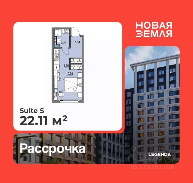 Продается 1-комн. квартира-студия от застройщика с предчистовой отделкой в ЖК "Новая Земля" на 7 этаже. Общая площадь: 19.67 кв.м., площадь гостиной 13.59 кв.м., из которых 6.12 кв.м. выделено под кухонную зону. Все окна выходят на одну сторону. В квартире один совмещенный санузел. Высота потолков 2.85 м. Квартира находится в корпусе 1.1. Дом монолитный, одноподъездный, высотой 17 этажей. На этаже 10 квартир. В подъезде 1 пассажирский и 1 грузовой лифт. Начало строительства - 1 квартал 2025 года. Окончание строительства - 4 квартал 2028 года. Оформление сделки по договору долевого участия. Новая Земля — проект LEGENDA в локации морской набережной Васильевского острова, где уже сегодня формируется многообещающее и перспективное место для жизни и инвестиций. Проект состоит из двух очередей, расположенных в непосредственной близости, но имеющих идеологически разный подход к проектированию и ассортиментному предложению. Первая очередь, где квартиры уже в продаже, наполнена компактными функциональными и эстетичными сьютами в комплектации TechnoBox, подходящими для активной аудитории, предпочитающей больше времени проводить в городе. Транспортная доступность обеспечена благодаря близости выезда на ЗСД, который позволяет быстро добраться как до центра города, так и до других районов Санкт-Петербурга. Архитектурная концепция проекта задает новый стандарт для этой локации. Дизайн фасадов, большие окна без импостов, современные инженерные решения — всё это создаёт атмосферу комфортного и эстетичного пространства, отвечающего самым высоким требованиям. В проекте представлена новая линейка планировочных решений, созданных по принципам отельного проектирования. Сьюты от LEGENDA — это уникальная работа с пространством, сочетающая сверхфункциональность и удобство, чистоту линий и стилистический минимализм. Планировочные решения в рамках первой очереди проекта будут поделены на несколько сегментов, отличающихся размерами, функциональной наполненностью и отвечающих потребностям различных жителей проекта.