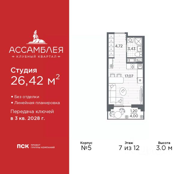 1-комн. квартира-студия в Клубный квартал "Ассамблея" на 7 этаже. Квартира без отделки, новый владелец может сделать ремонт по своему проекту. Общая площадь: 27.14 кв.м., площадь гостиной 17.51 кв.м., из которых 5 кв.м. выделено под кухонную зону. Все окна выходят на одну сторону. В квартире один балкон, один совмещенный санузел. Высота потолков 3.0 м.