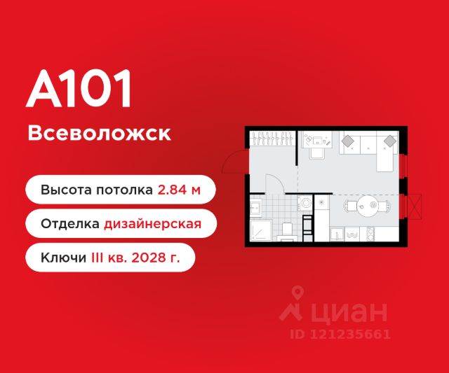 Студия площадью 20.60 в ЖК "А101 Всеволожск" c лоджией на 8 этаже. Квартира с предчистовой отделкой. Вид из окна во двор. В квартире 1 санузел. Высота потолков 2.8 м. Особенность планировки - гардеробная. ОТДЕЛКА Квартира с предчистовой отделкой предполагает: качественную стяжку на полах под финишное покрытие, потолок с обеспыливающей грунтовкой белого цвета, ровные стены с покрытием штукатурка. Выполнены все работы по проведению электрики. На все отделочные работы от застройщика предоставляется гарантия. Если вы хотите дозаказать дизайнерскую отделку, обращайтесь к нашими специалистами. ОСОБЕННОСТИ ПЛАНИРОВКИ Места для хранения находятся в прихожей и жилой зоне квартиры, дополнительно можно получить доступ к кладовым на подземном уровне (площадь - 2-8 кв. м). ДВОРЫ И ОКРУЖЕНИЕ Большая часть территории комплекса отведена под зелёные благоустроенные зоны: теневые сады, уютные городские пространства с развитой тротуарной сетью и велодорожками - всё для вашего активного и здорового образа жизни. Внутренние дворы закрыты от посторонних и свободны от автомобилей. Каждый дом оснащён высокотехнологичными системами видеонаблюдения и контроля доступа, обеспечивая максимум безопасности и спокойствия для вас и ваших близких. Окружение района - живописный природный ландшафт. Всего в 5 минутах ходьбы располагается Ковалёвский лесопарк - источник кислорода, пространство для спорта, отдыха и приятных прогулок на свежем воздухе. ПАРАДНАЯ Мягкая мебель, живые растения и натуральные материалы в отделке формируют современный и уютный интерьер входной группы, радующий глаз и создающий приятную атмосферу для встреч с гостями. Для вашего удобства реализован безбарьерный вход, отвечающий требованиям доступной среды для всех жильцов, а также в каждой парадной имеется отдельное помещение для хранения колясок и велосипедов. ИНФРАСТРУКТУРА: В жилой застройке сохранена естественная среда благодаря разнообразию растительности, извилистым дорожкам и уличной мебели из натуральных материалов. Здесь находится насыщенная сеть экотроп протяжённостью более 10 км прямо у дома, а просторная площадь позволяет жителям приятно провести время, общаться с соседями и отдыхать. Также предусмотрены зоны для отдыха и специально оборудованные спортивные площадки для активного образа жизни на свежем воздухе. На территории района ГК "А101" создает современный учебно-образовательный кластер, В "А1О1 Всеволожск" предусмотрена современная школа на 1300 учеников и 2 детских сада Всё самое необходимое - рядом с вашим домом. Выпить утром кофе в уютном кафе или поужинать с друзьями, отвести детей на развивающие занятия или игровую площадку, купить продукты и товары первой необходимости. В проекте запланировано уникальное гастрономическое пространство, располагающееся на основном пешеходном бульваре жилого района. Территория дополнительно оборудована местами отдыха на свежем воздухе, а для ресторанов и кафе будет предусмотрена возможность организации летних веранд. ЗАСТРОЙЩИК: ГК "А101" - од