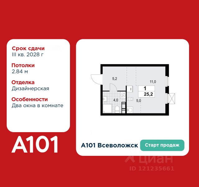 Видовая студия площадью 20.80 в ЖК "А101 Всеволожск" c лоджией на 8 этаже. Квартира с отделкой. Вид из окна во двор. В квартире 1 санузел. Высота потолков 2.95 м. Предложения от застройщика на декабрь 2025: - Гибкая рассрочка 20 000 руб/мес. и первым взносом 10%. ОТДЕЛКА Для квартир с чистовой отделкой предлагается три варианта дизайна: Классика, Карелия светлая и Карелия темная. Варианты всех дизайнерских решений представлены на фотографиях. Подробности можно уточнить у менеджера. На все отделочные работы от застройщика предоставляется гарантия. ОСОБЕННОСТИ ПЛАНИРОВКИ Глубокая лоджия от 1,4м позволяет организовать отдельный кабинет, мастерскую или зимний сад с лаундж-зоной. ПАРАДНАЯ В каждой парадной предусмотрены места для хранения велосипедов и колясок, гостевой санузел, лапамойка (место для мытья домашних животных или колес велосипедов) и удобная зона ожидания для гостей. ДВОРЫ И ОКРУЖЕНИЕ Просторные дворы свободны от машин и закрыты от посторонних. Большую часть комплекса займут благоустроенные зелёные зоны, теневые сады и городские общественные пространства с развитой тротуарной сетью и велодорожками. Каждый дом оборудован системами видеонаблюдения и контроля доступа. "А101 Лаголово" - современный город у подножия знаменитых Дудерговских высот, в объятиях чистейших озёр и зелёных живописных массивов, наполненный всем необходимым для счастливой жизни. Не хватает средств на покупку кладового помещения? Оформите ипотеку на квартиру и добавьте к ней часть стоимости кладовой. ЗАСТРОЙЩИК ГК "А101" - крупный инвестиционно-строительный холдинг, занимает 6-е место по объему строительства в России (по данным "Единого ресурса застройщиков" на 2023 год). НКР присвоило ГК "А101" кредитный рейтинг A+.ru, подтверждая его надежность и финансовую устойчивость для завершения строительства ЖК.