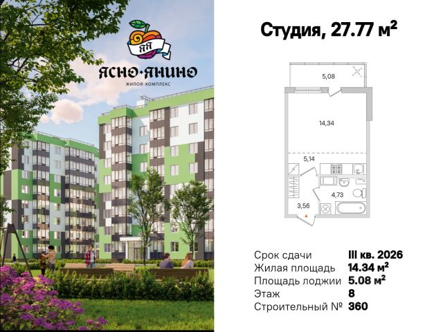 Продаётся квартира-студия площадью 21,9 кв.м на 8 этаже 15 этажного дома (Корпус 2, Секция 2) проекта ПИК Янинский лес. Светлый просторный подъезд на уровне земли, функциональная планировка, большие окна, c отделкой. Жилой квартал "Янинский лес" возводится в районе Янино-1 Ленинградской области. Автобусная остановка находится в 3 минутах пешком. Проект расположен вплотную к восточной границе Санкт-Петербурга - в 4 минутах от КАД. До метро "Ладожская" - 23 минуты на общественном транспорте. До исторического центра города можно доехать за 25 минут на автомобиле. "Янинский лес" - масштабный проект из 32 жилых корпусов, где будет всё для комфортной жизни. Здесь предусмотрены надземные паркинги, откроются детские сады, школа и поликлиника. Кроме этого, появятся места, в которых можно проводить свободное время: ледовая арена и торговый центр площадью больше 3000 м². Жилой район строится по всем правилам ПИК-Стандарта: в зелёных дворах-парках появятся современные детские и спортивные площадки, пешеходный бульвар и другие места для отдыха. На первых этажах разместятся магазины, кафе и другие сервисы. Во дворах не будет автомобилей, а для гостей предусмотрены парковочные места. Проект окружают лесные массивы. В пешей доступности находится Ржевский лесопарк: летом там можно гулять и собирать грибы, а зимой кататься на лыжах. Также рядом расположен памятник природы Колтушские высоты - парк с обустроенными экотропами и веломаршрутом. А главное место притяжения местных жителей - озеро с обустроенным местом для пикников. Артикул 1049184 (Застройщик ООО "СПЕЦИАЛИЗИРОВАННЫЙ ЗАСТРОЙЩИК"ЭКСТРАГРАД") [cn_sbp_1861034]