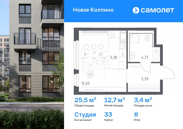 Строим кварталы для жизни с заботой о будущем. Предлагается квартира студия комфорт-класса 25,49 кв.м в корпусе 33 на 8 этаже, в ЖК "Новое Колпино" Квартира с предчистовой отделкой. Доступность дополнительных опций уточняйте у застройщика. Приобрести квартиру возможно по специальным акциям от застройщика, с текущими условиями акций можно ознакомиться в блоке "Акций". Цена динамическая и может отличаться, уточняйте актуальность у застройщика. Квартал "Новое Колпино" — современный квартал в тихом и зеленом районе Санкт-Петербурга. Здесь можно подолгу любоваться пышными кронами деревьев, подставляя лицо теплым лучам солнца. А еще в любой момент можно сесть в машину и уже через час оказаться в сердце Северной столицы. Будет легко планировать поездки: до центра Петербурга, или площади Восстания, — 25 минут на поезде. С территории квартала удобно выезжать на крупные магистрали: путь до Южного шоссе займет 15 минут на авто, а до Петрозаводского шоссе — всего 6 минут. В 20 минутах на авто находится метро "Рыбацкое", а в 7 минутах — ж/д станция Колпино. Проводите выходные на природе в Колпинском парке, который находится недалеко от квартала, на берегу реки Ижоры. Летом здесь можно вместе с детьми веселиться на аттракционах, кататься на лодке, играть в бадминтон или волейбол. А еще можно захватить орехов и покормить белок. Всего 7 минут на авто или автобусе — и вы в центре города Колпино. Взрослых впечатлит русская архитектура старинных церквей, а детям понравится забавный памятник героям мультфильма "Трое из Простоквашино". В "Новом Колпино" будут работать 4 детских сада, 3 из них уже готовы встречать малышей. Ребята постарше могут ходить на занятия в школу с собственным бассейном, в проекте уже работает новая современная школа с бассейном Корпуса высотой 11 этажей с французскими и панорамными балконами отделаны штукатуркой и облицовочным кирпичом. Вдохновение для палитры нам подарили оттенки рассветного неба: терракотовый, персиковый, песочный. Во дворе найдется интересное занятие для всех жителей квартала. Взрослые смогут устраивать тренировки на свежем воздухе в спортивных зонах, дети будут целый день веселиться на игровых площадках. А еще мы позаботились о вашей безопасности и закрыли дворы от машин. Возвращайтесь домой с чемоданом из путешествия или коляской из парка. На пути в подъезд вы не встретите ступенек. Оставить транспорт можно будет в специальном помещении на первом этаже. По желанию вы сможете получить ключи от квартиры с готовой отделкой. Мы положим ламинат, поклеим обои, установим мебель и сантехнику. Доступен вариант с готовой кухней — бежевые тона отделки станут фоном для интерьера мечты. Чтобы сразу отпраздновать новоселье, закажите у нас декор и мебельные сеты. А если хочется воплотить собственные идеи в интерьере, присмотритесь к опции — без отделки.