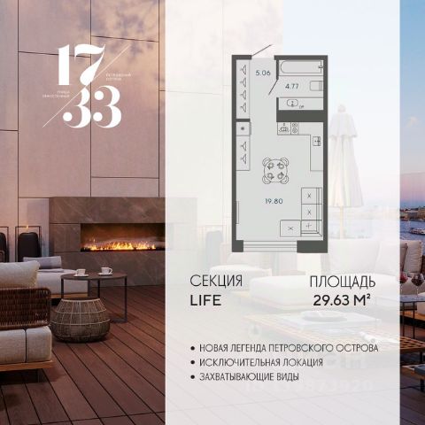 Сдаем в 2026 году! Апартамент 293 в Комплексе "17/33 Петровский остров" О проекте: Премиальный комплекс резиденций для истинных ценителей изысканной архитектуры, непревзойденного сервиса и необыкновенной панорамы Санкт-Петербурга. Уникальное расположение между Малой Невой и Петровским прудом подарит будущим резидентам неповторимое ощущение жизни на собственном уединенном острове. Уникальная локация. Проект расположен в объятьях главных островов Петербурга — Петроградской стороны, Васильевского и Крестовского, и в самой зеленой и выигрышной части Петровского — на первой линии Малой Невы, между величественной рекой и тихим Петровским прудом. До ключевых точек притяжения, любимых парков, шопинга и развлечений — пара минут на авто. 100% видовых апартаментов. Виды на Малую Невку, на Петровский пруд.; Проект разделен на три формата: Club, Life, Residence; 5-8 этажей; высота потолка до 7 метров; 1000 м2 общественных пространств; фитнес и СПА; кинозал и зал для семейных торжеств; коворкинг и детский клуб; лаундж с библиотекой; терраса площадью 120 м2 для резидентов; ELEMENT создаёт инновационные жилые и коммерческие объекты в Санкт-Петербурге и Москве, которые устанавливают новые стандарты эффективной жизни в мегаполисах.