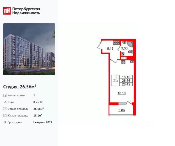 Продается просторная студия от застройщика в жилом комплексе "Бионика Заповедная" в динамичном Приморском районе. До метро можно добраться на транспорте всего за 11 минут. Удобная, классическая, функциональная европланировка, просторная прихожая 5.16 м². Общая площадь студии - 26.56 м², жилая 18.1 м², высота потолка 2.77 м. Квартира продается с отделкой "NORD LINE SILVER ВК NEW". Что особенного в ЖК "Бионика Заповедная"? • Оазис в городе 3 минуты пешком до Новоорловского заказника (140 ГА) • Захватывающие виды из окон на хвойный лесопарк • Всесезонный "Заповедный парк" во дворе площадью 23000 кв.м. • 5 единых входных групп с авторским дизайном и лаундж-зонами, сити-виллы на первых этажах с палисадниками и высотой потолков до 4 м • Места притяжения: фонтан "Бионика", спортивный кластер со скейт-парком, фотозоны с арт-объектами