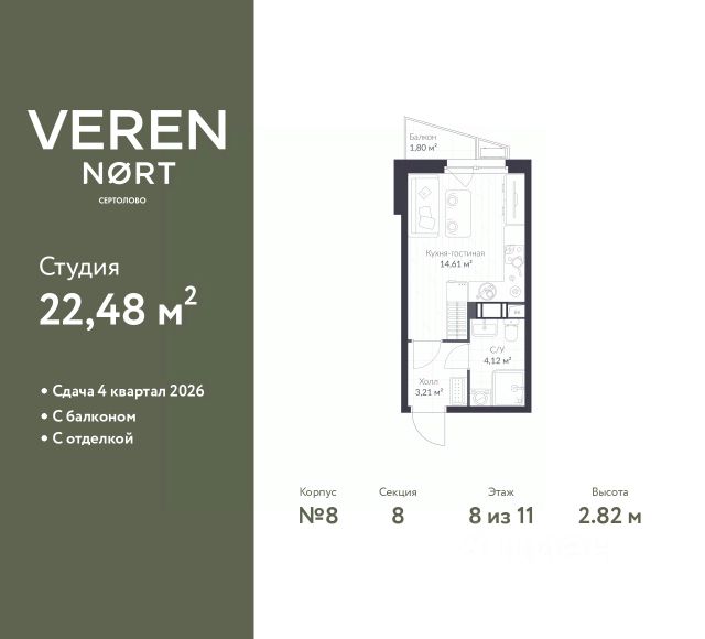 Торопитесь забронировать по этой цене! Предложение ограничено! Стоимость квартиры указана со скидкой, ваша экономия составит 487,199 RUB. По всем вопросам звоните в офис продаж, мы вам все подробно расскажем! Просторная однокомнатная квартира-студия с предчистовой отделкой в Veren Nort Сертолово на 8 этаже. Общая площадь: 22.48 кв.м., площадь гостиной 14.61 кв.м., из которых 5 кв.м. выделено под кухонную зону. Все окна выходят на одну сторону. В квартире один балкон, один совмещенный санузел. Высота потолков 2.82 м. Квартира находится в корпусе 8. Дом монолитный, одноподъездный, высотой 11 этажей. На этаже 14 квартир. В подъезде 1 пассажирский и 1 грузовой лифт. Окончание строительства - 4 квартал 2026 года. Оформление сделки по договору долевого участия. С балконом, с отделкой, вид на приватный двор. Сочетание современной архитектуры и отличной экологии севера Лен. области. Выразительный облик домов разработан именитым архитектурным бюро "Остоженка". Характеристики жилого комплекса исключительны: продуманный ландшафтный дизайн, оригинальные парадные, разработанные по индивидуальному дизайн-проекту, современные детские и многофункциональные спортивные площадки, летний кинотеатр под открытым небом, два детских сада. Комплекс создается в уже сложившейся инфраструктуре г. Сертолово и обладает удобным транспортным сообщением с Санкт-Петербургом. В 300 метрах от "VEREN NORT сертолово" планируется транспортно-пересадочный узел "Сертолово", который обеспечит удобную железнодорожную связь с Финляндским вокзалом Санкт-Петербурга. #zwe4Vd