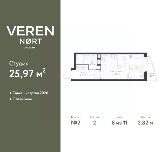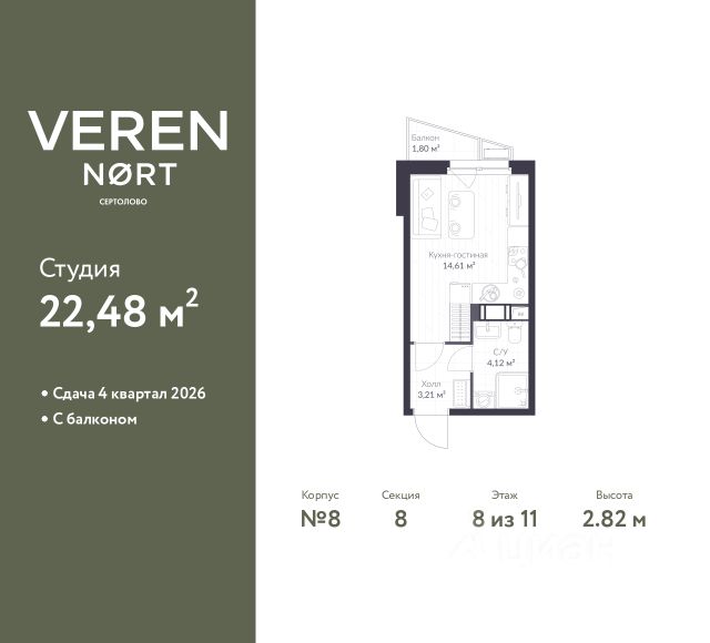 Торопитесь оформить бронирование, пока действует скидка, предложение ограничено! Стоимость квартиры указана со скидкой, ваша экономия составит 1,573,625 руб. Информация по телефону, мы вам все подробно расскажем. Продается однокомнатная квартира-студия от застройщика в Veren Nort Сертолово на 8 этаже. Квартира без отделки, после оформления собственности можно делать ремонт. Общая площадь: 24.6 кв.м., площадь гостиной 15.82 кв.м., из которых 5 кв.м. выделено под кухонную зону. Все окна выходят на одну сторону. В квартире один балкон, один совмещенный санузел. Высота потолков 2.82 м. Квартира находится в корпусе 1. Дом монолитный, одноподъездный, высотой 11 этажей. На этаже 14 квартир. В подъезде 2 грузовых лифта. Начало строительства - 3 квартал 2023 года. Окончание строительства - 1 квартал 2026 года. Оформление сделки по договору долевого участия. С балконом, вид на приватный двор. Сочетание современной архитектуры и отличной экологии севера Лен. области. Выразительный облик домов разработан именитым архитектурным бюро "Остоженка". Характеристики жилого комплекса исключительны: продуманный ландшафтный дизайн, оригинальные парадные, разработанные по индивидуальному дизайн-проекту, современные детские и многофункциональные спортивные площадки, летний кинотеатр под открытым небом, два детских сада. Комплекс создается в уже сложившейся инфраструктуре г. Сертолово и обладает удобным транспортным сообщением с Санкт-Петербургом. В 300 метрах от "VEREN NORT сертолово" планируется транспортно-пересадочный узел "Сертолово", который обеспечит удобную железнодорожную связь с Финляндским вокзалом Санкт-Петербурга. #Z3DVdM