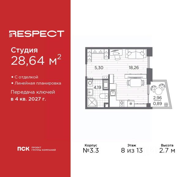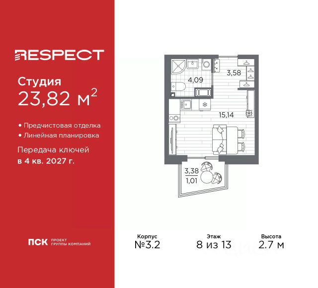 Просторная 1-комн. квартира-студия с предчистовой отделкой в ЖК "RESPECT" на 8 этаже. Общая площадь: 23.82 кв.м., площадь гостиной 15.14 кв.м., из которых 5 кв.м. выделено под кухонную зону. Все окна выходят на одну сторону. В квартире один балкон, один совмещенный санузел. Высота потолков 2.7 м. Дом монолитный, многоподъездный, переменной этажности, от 10 до 13 этажей. Квартира находится в 1-й секции высотой 13 этажей в корпусе 3.2. На этаже 5 квартир. В подъезде 1 пассажирский и 1 грузовой лифт. Начало строительства - 3 квартал 2025 года. Окончание строительства - 4 квартал 2027 года. Оформление сделки по договору долевого участия. В шаговой доступности от жилого комплекса расположены станции метро (расстояние по прямой): "Лесная" (800 м), "Площадь Мужества" (1.4 км), "Выборгская" (1.9 км), также недалеко от этого корпуса находятся станции метро: "Академическая", "Политехническая". Квартал строится на Полюстровском пр, 87, в одной из самых востребованных локаций Петербурга. В 10 минутах пешком - метро "Лесная" и в 10 минутах на транспорте - Петроградская сторона. Высота домов от 7 до 13 этажей. На территории Respect строится школа на 1125 учащихся и детский сад на 240 мест. Запроектированы собственная газовая котельная, закрытая территория, дворы без машин и подземные паркинги с лифтами. Вентилируемые фасады облицованы клинкерным кирпичом. Дома из этого материала служат веками, являясь гордостью хозяев. Дизайн парадных зон и входных групп - сочетание лаконичности отделки и декоративных элементов с текстурами из натурального камня и дерева с приглушенной подсветкой теплым светом. Во входных группах расположены гостевые зоны с мягкой мебелью. Вся территория квартала будет связана единой концепцией благоустройства, разработанной ландшафтным бюро L.BURO. В основе - идея создания увлекательного ландшафтного пространства для насыщенной жизни, включающего в себя пейзажные зоны, современные архитектурные композиции, открытые террасы на стилобатах с зонами отдыха и парклетами, спортивными площадками. Это пространство для людей всех возрастов и различных увлечений. На эксплуатируемой кровле на уровне первого этажа в домах 1 и 4 будут обустроены общественные видовые террасы. В квартале запроектированы внутренние закрытые территории дворов домов без доступа автомобилей и безбарьерная среда для велосипедистов и колясок. Предусмотрены IP-домофония с функцией дистанционного открывания калиток и парадных, а также дистанционный сбор показаний счетчиков и мобильное приложение для жителей. Для безопасности жителей квартала - круглосуточное видеонаблюдение и служба охраны. В каждой квартире предусмотрены внешние корзины для кондиционеров. #2MBBMv