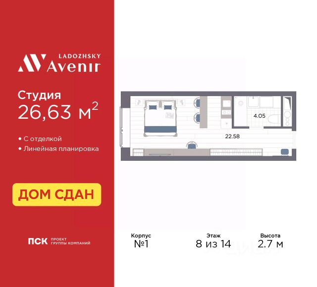 Просторные однокомнатные апартаменты-студия с отделкой в ЖК "Ladozhsky AVENIR" на 8 этаже. Общая площадь: 27.61 кв.м., площадь гостиной 23.56 кв.м., из которых 5 кв.м. выделено под кухонную зону. Все окна выходят на одну сторону. В апартаментах один совмещенный санузел. Высота потолков 2.7 м. Апартаменты находятся в корпусе 1. Дом монолитный, одноподъездный, высотой 14 этажей. На этаже 50 квартир. В подъезде 4 пассажирских и 4 грузовых лифта. В шаговой доступности от дома имеются станции метро (расстояние по прямой): "Ладожская" (800 м), "Новочеркасская" (1.7 км), также недалеко от этого корпуса находятся станции метро: "Площадь Александра Невского", "Чернышевская", "Площадь Восстания". Тест-драйв в готовых апартаментах. Перед покупкой можно арендовать номер для проживания с компенсацией от застройщика. Ladozhsky AVENIR — апартотель бизнескласса в историческом районе Матросская слобода на Правобережье Невы в 10 минутах пешком от станции метро "Ладожская" и 10 минутах на автомобиле до Невского проспекта. Апартотель Ladozhsky AVENIR — четвертый проект сети сервисных апартотелей AVENIR и первый мультиформатный проект, включающий в себя апартаменты, офисы и коммерческие помещения. Относится к высокому сегменту "Бизнес - класс" Все апартаменты сдаются с отделкой "под ключ" в единой стилистике. Семейная ипотека на апартаменты не распространяется. Деятельность по сдаче апартаментов в аренду осуществляет управляющая компания PSK INVEST, входящая в группу компаний "ПСК". Для передачи апартамента в управление PSK IINVEST необходимо заключить договор на приобретение пакета "Меблировка и оснащение". #26bmS3