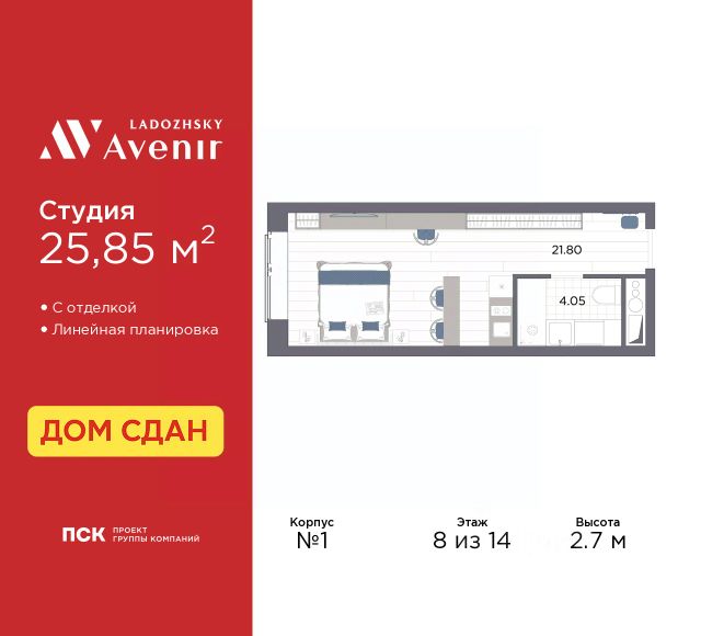 Продаются 1-комн. апартаменты-студия от застройщика с отделкой в ЖК "Ladozhsky AVENIR" на 8 этаже. Общая площадь: 27.61 кв.м., площадь гостиной 23.56 кв.м., из которых 5 кв.м. выделено под кухонную зону. Все окна выходят на одну сторону. В апартаментах один совмещенный санузел. Высота потолков 2.7 м. Апартаменты находятся в корпусе 1. Дом монолитный, одноподъездный, высотой 14 этажей. На этаже 50 квартир. В подъезде 4 пассажирских и 4 грузовых лифта. В шаговой доступности от дома находятся станции метро (расстояние по прямой): "Ладожская" (800 м), "Новочеркасская" (1.7 км), также недалеко от этого корпуса расположены станции метро: "Площадь Александра Невского", "Чернышевская", "Площадь Восстания". Тест-драйв в готовых апартаментах. Перед покупкой можно арендовать номер для проживания с компенсацией от застройщика. Ladozhsky AVENIR — апартотель бизнескласса в историческом районе Матросская слобода на Правобережье Невы в 10 минутах пешком от станции метро "Ладожская" и 10 минутах на автомобиле до Невского проспекта. Апартотель Ladozhsky AVENIR — четвертый проект сети сервисных апартотелей AVENIR и первый мультиформатный проект, включающий в себя апартаменты, офисы и коммерческие помещения. Относится к высокому сегменту "Бизнес - класс" Все апартаменты сдаются с отделкой "под ключ" в единой стилистике. Семейная ипотека на апартаменты не распространяется. Деятельность по сдаче апартаментов в аренду осуществляет управляющая компания PSK INVEST, входящая в группу компаний "ПСК". Для передачи апартамента в управление PSK IINVEST необходимо заключить договор на приобретение пакета "Меблировка и оснащение". #2MbMSU