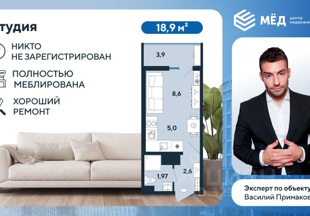Студия с отделкой и мебелью у Новоорловского лесопарка. О квартире: - Общая площадь - 18,9 кв.м без учета лоджии - Застекленная лоджия - 3,9 кв.м - Жилая комната - 13,6 кв.м - Совмещенный санузел - 2,7 кв.м - Прихожая - 2,6 кв.м - 8 этаж - Юго-западная сторона Квартира продается с современной отделкой от собственника в нейтральных тонах. В санузле плитка на полу и стенах. Укомплектована всей необходимой для жизни мебелью и техникой. В квартире уже проживает хороший арендатор - идеальная покупка под сдачу, без поиска жильцов. О жилом комплексе: - ЖК Заповедный парк, 2022 год постройки - Материал стен - монолит - На территории комплекса собственный детский сад, фитнес-клуб, большое количество парковочных мест Инфраструктура: - Развитый микрорайон, в пешей доступности супермаркеты, кафе и пекарни, салоны красоты, медцентры и пункты выдачи товаров. - 5 минут пешком до Новоорловского заповедника: излюбленного места жителей района для велопрогулок вдали от городской суеты. - 15 минут на автобусе до станции метро Проспект Просвещения. - 15 минут на автомобиле до выезда на КАД и ЗСД. Звоните, расскажу подробнее!) О сделке: - Прямая продажа - Ипотека возможна, обременение Сбербанка - Один взрослый собственник, никто не зарегистрирован - Вся цена в договоре Одобрение ипотеки, проведение сделки - бесплатно!