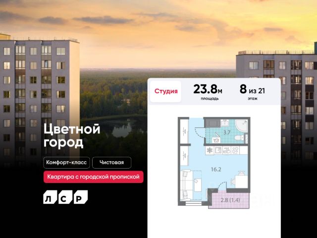 Цена действует при 100% оплате и на определенные ипотечные программы. Подробности — в отделе продаж по телефону. Продается студия в ЖК "Цветной город" на 8 этаже. Общая площадь составляет 23.80 кв. м. Квартира с чистовой отделкой Срок сдачи дома: 3 квартал 2026. Жилой комплекс "Цветной город" располагается по адресу Санкт-Петербург, Красногвардейский. "Цветной город" - современный масштабный эко-проект: жилые кварталы со своей сетью улиц, пешеходными бульварами и велодорожками, площадками для спорта и отдыха. Кварталы располагаются вдоль береговой линии реки Охты. "Цветной город" - это жизнь вблизи природы, но с городской пропиской. К 2026 году на берегах реки Охты будет создан Пейзажный парк с летними экотропами и зимними горками для тюбингов, скейт-парком и летним кинотеатром. В ЖК "Цветной город" запланировано и уже частично реализовано строительство 10 школ, 16 детских садов, 4 поликлиники, больница, ТРК, спортивно-оздоровительные сервисы С центром Петербурга жителей "Цветного города" свяжет Пискарёвский проспект, удобный выезд на КАД позволяет без труда добираться до других районов. Расположение: • 10 минут на авто до КАД; • 15 минут на авто до станций "Гражданский проспект" и "Академическая"; • 20 минут до ж/д станции "Ручьи".; Квартира сдается с готовой отделкой из современных экологичных материалов: на стенах плотные белые обои под покраску, на полу износостойкий матовый ламинат, в санузлах керамическая плитка на стенах и керамогранит на полу. Трубы отопления скрыты в стяжке пола и не мешают мебели. В квартире предусмотрено большое количество двойных розеток и выключателей. В ЖК "Цветной город" предусмотрена система "Умный дом": смартфон с приложением является ключом от всех дверей в ЖК, гостевой доступ оформляется в приложении, видеозвонки от домофона поступают в приложение, показания счетчиков автоматически передаются в учетные базы ЖКХ. Преимущества: • Рядом лесопарк и река Охта • Живописные виды из окон • Безбарьерная среда • Развитая социальная инфраструктура • Система "Умный дом" Успейте приобрести квартиру на выгодных условиях! Чтобы узнать подробности, обращайтесь за консультацией по телефону.