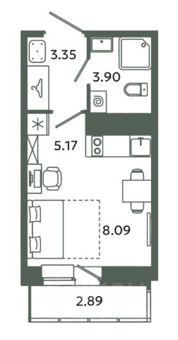 Однокомнатная квартира-студия с предчистовой отделкой в ЖК "Брусника в Новоселье" на 9 этаже. Общая площадь: 32.95 кв.м., площадь гостиной 21.7 кв.м., из которых 5 кв.м. выделено под кухонную зону. Все окна выходят на одну сторону. В квартире один балкон, один совмещенный санузел. Высота потолков 2.7 м.