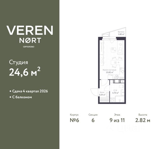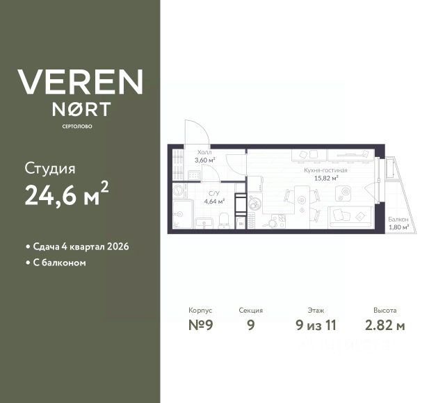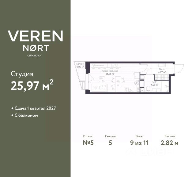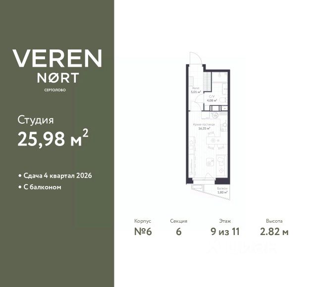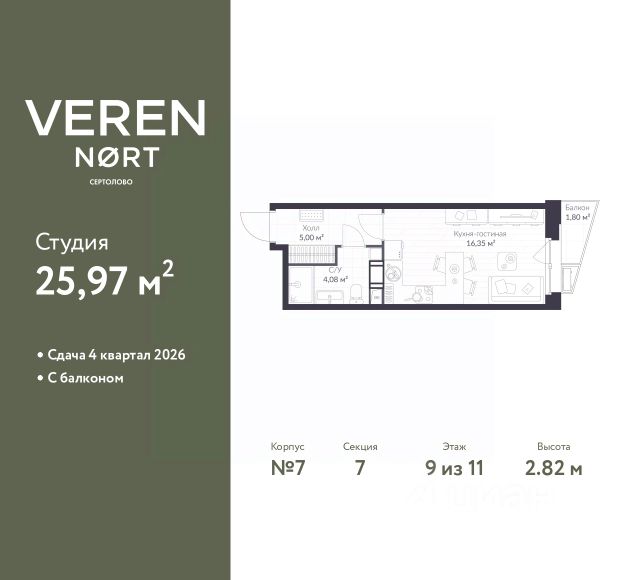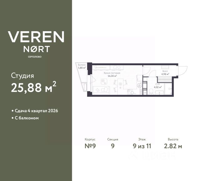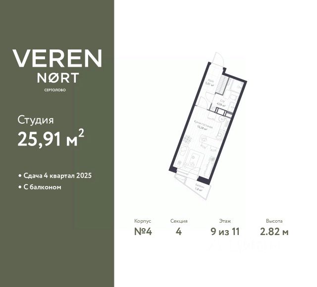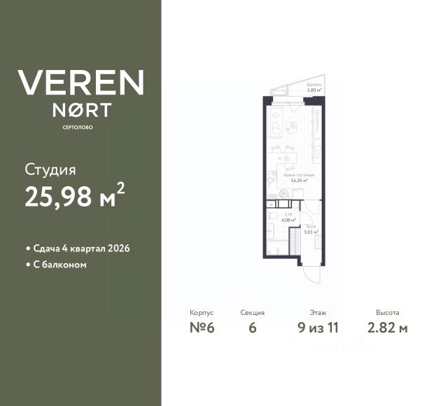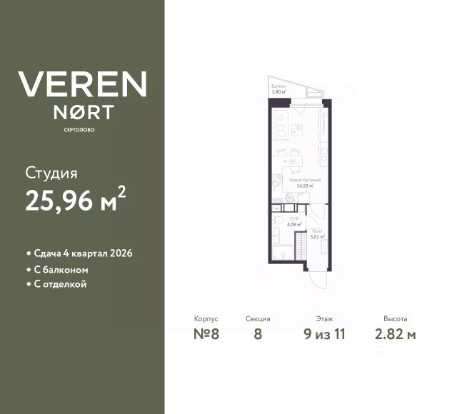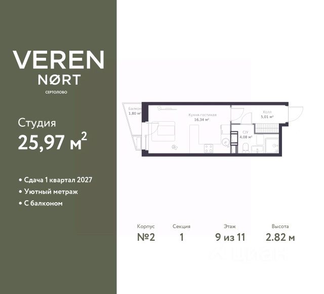 Торопитесь оформить бронирование, пока действует скидка! Предложение ограничено! Стоимость квартиры указана со скидкой, ваша экономия составит 1,348,086 RUB. По всем вопросам звоните в офис продаж, мы вам все подробно расскажем! Однокомнатная квартира-студия в Veren Nort Сертолово на 9 этаже. Квартира без отделки, после получения ключей можно делать ремонт. Общая площадь: 25.97 кв.м., площадь гостиной 16.34 кв.м., из которых 3 кв.м. выделено под кухонную зону. Все окна выходят на одну сторону. В квартире один балкон, один совмещенный санузел. Высота потолков 2.82 м. Квартира находится в корпусе 4. Дом монолитный, одноподъездный, высотой 11 этажей. На этаже 14 квартир. В подъезде 1 пассажирский и 1 грузовой лифт. Начало строительства - 3 квартал 2023 года. Окончание строительства - 4 квартал 2025 года. Оформление сделки по договору долевого участия. С балконом, вид на приватный двор. Сочетание современной архитектуры и отличной экологии севера Лен. области. Выразительный облик домов разработан именитым архитектурным бюро "Остоженка". Характеристики жилого комплекса исключительны: продуманный ландшафтный дизайн, оригинальные парадные, разработанные по индивидуальному дизайн-проекту, современные детские и многофункциональные спортивные площадки, летний кинотеатр под открытым небом, два детских сада. Комплекс создается в уже сложившейся инфраструктуре г. Сертолово и обладает удобным транспортным сообщением с Санкт-Петербургом. В 300 метрах от "VEREN NORT сертолово" планируется транспортно-пересадочный узел "Сертолово", который обеспечит удобную железнодорожную связь с Финляндским вокзалом Санкт-Петербурга. #z3dVfo