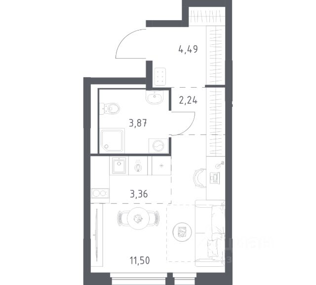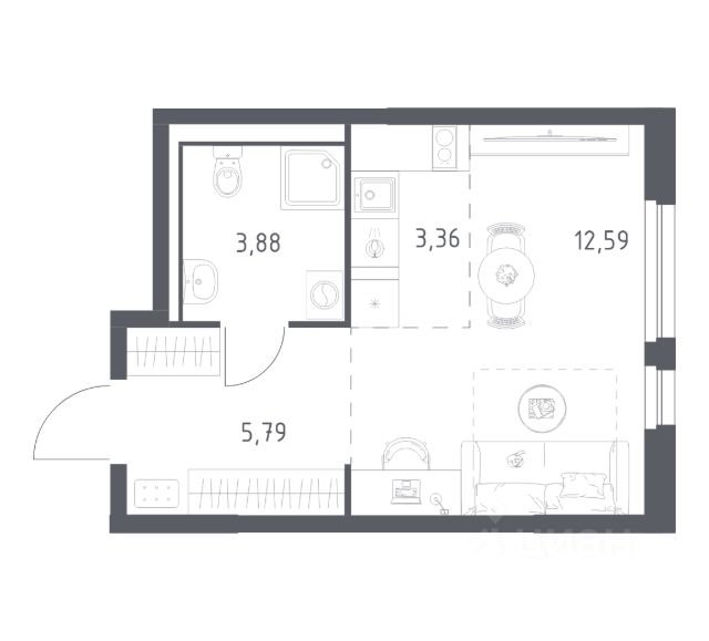 Просторная студия с двумя окнами, лоджией и большой прихожей.