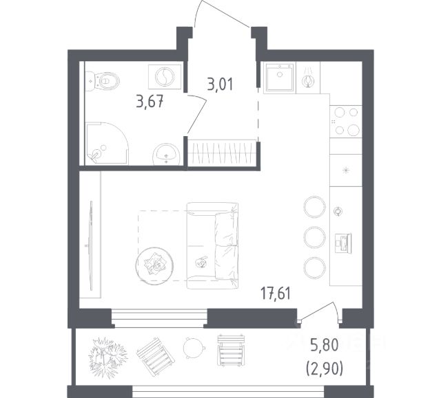 Просторная студия с двумя окнами, лоджией и большой прихожей.