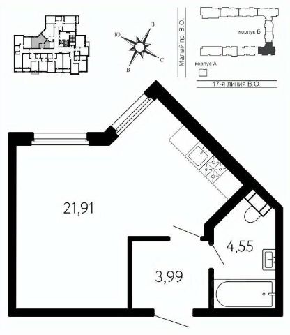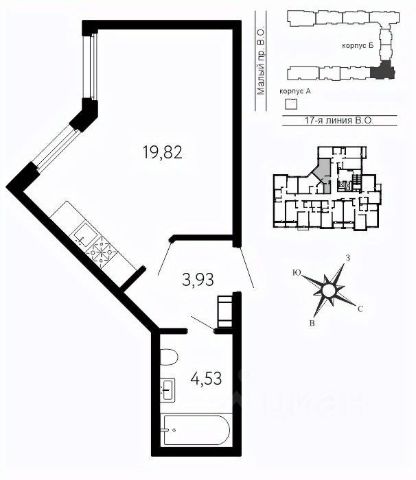 Продается 1-комн. квартира-студия с предчистовой отделкой в ЖК "Новая Земля" на 9 этаже. Общая площадь: 19.13 кв.м., площадь гостиной 13.52 кв.м., из которых 5.7 кв.м. выделено под кухонную зону. Все окна выходят на одну сторону. В квартире один совмещенный санузел. Высота потолков 2.85 м. Квартира находится в корпусе 1.3. Дом монолитный, одноподъездный, высотой 17 этажей. На этаже 12 квартир. В подъезде 1 пассажирский и 1 грузовой лифт. Окончание строительства - 4 квартал 2028 года. Оформление сделки по договору долевого участия. Новая Земля — проект LEGENDA в локации морской набережной Васильевского острова, где уже сегодня формируется многообещающее и перспективное место для жизни и инвестиций. Проект состоит из двух очередей, расположенных в непосредственной близости, но имеющих идеологически разный подход к проектированию и ассортиментному предложению. Первая очередь, где квартиры уже в продаже, наполнена компактными функциональными и эстетичными сьютами в комплектации TechnoBox, подходящими для активной аудитории, предпочитающей больше времени проводить в городе. Транспортная доступность обеспечена благодаря близости выезда на ЗСД, который позволяет быстро добраться как до центра города, так и до других районов Санкт-Петербурга. Архитектурная концепция проекта задает новый стандарт для этой локации. Дизайн фасадов, большие окна без импостов, современные инженерные решения — всё это создаёт атмосферу комфортного и эстетичного пространства, отвечающего самым высоким требованиям. В проекте представлена новая линейка планировочных решений, созданных по принципам отельного проектирования. Сьюты от LEGENDA — это уникальная работа с пространством, сочетающая сверхфункциональность и удобство, чистоту линий и стилистический минимализм. Планировочные решения в рамках первой очереди проекта будут поделены на несколько сегментов, отличающихся размерами, функциональной наполненностью и отвечающих потребностям различных жителей проекта.