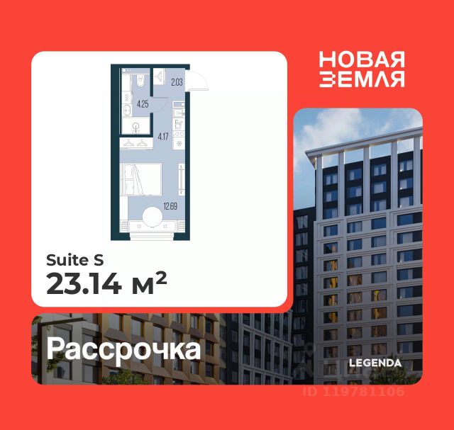 1-комн. квартира-студия с предчистовой отделкой в ЖК "Новая Земля" на 9 этаже. Общая площадь: 23.14 кв.м., площадь гостиной 16.86 кв.м., из которых 4.17 кв.м. выделено под кухонную зону. Все окна выходят на одну сторону. В квартире один совмещенный санузел. Высота потолков 2.85 м. Квартира находится в корпусе 1.8. Дом монолитный, одноподъездный, высотой 15 этажей. На этаже 8 квартир. В подъезде 2 пассажирских и 1 грузовой лифт. Окончание строительства - 4 квартал 2028 года. Оформление сделки по договору долевого участия. Новая Земля — проект LEGENDA в локации морской набережной Васильевского острова, где уже сегодня формируется многообещающее и перспективное место для жизни и инвестиций. Проект состоит из двух очередей, расположенных в непосредственной близости, но имеющих идеологически разный подход к проектированию и ассортиментному предложению. Первая очередь, где квартиры уже в продаже, наполнена компактными функциональными и эстетичными сьютами в комплектации TechnoBox, подходящими для активной аудитории, предпочитающей больше времени проводить в городе. Транспортная доступность обеспечена благодаря близости выезда на ЗСД, который позволяет быстро добраться как до центра города, так и до других районов Санкт-Петербурга. Архитектурная концепция проекта задает новый стандарт для этой локации. Дизайн фасадов, большие окна без импостов, современные инженерные решения — всё это создаёт атмосферу комфортного и эстетичного пространства, отвечающего самым высоким требованиям. В проекте представлена новая линейка планировочных решений, созданных по принципам отельного проектирования. Сьюты от LEGENDA — это уникальная работа с пространством, сочетающая сверхфункциональность и удобство, чистоту линий и стилистический минимализм. Планировочные решения в рамках первой очереди проекта будут поделены на несколько сегментов, отличающихся размерами, функциональной наполненностью и отвечающих потребностям различных жителей проекта.