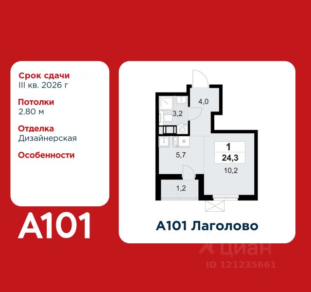 ПЕРЕУСТУПКА ПРАВА! Продаётся квартира в новостройке — ЖК "Лаголово" , корп. 1.3-1 Общая площадь квартиры — 24,3 кв. м., этаж 11 из 11, секция 3 Отделка - Классика Тип проекта, по которому построен дом — монолит Компания-застройщик — ГК "А101". Стоимость квартиры — 5 053 912 руб. Срок сдачи — 1-й квартал 2027 Более подробная информация по телефону. ПАРАДНАЯ В каждой парадной предусмотрены места для хранения велосипедов и колясок, гостевой санузел, лапамойка (место для мытья домашних животных или колес велосипедов) и удобная зона ожидания для гостей. ДВОРЫ И ОКРУЖЕНИЕ Просторные дворы свободны от машин и закрыты от посторонних. Большую часть комплекса займут благоустроенные зелёные зоны, теневые сады и городские общественные пространства с развитой тротуарной сетью и велодорожками. Каждый дом оборудован системами видеонаблюдения и контроля доступа. "А101 Лаголово" - современный город у подножия знаменитых Дудерговских высот, в объятиях чистейших озёр и зелёных живописных массивов, наполненный всем необходимым для счастливой жизни. ИНФРАСТРУКТУРА. Мы занимаемся комплексным освоением территории. Наш приоритет - доступность всех сервисов для счастливой жизни. 1. Лаголово-город 15-ти минутной доступности. Вся необходимая инфраструктура: магазины, салоны красоты, образовательные учреждения, медицинские центры находятся в 15-ти минутах пешей прогулки от любой точки жилого комплекса. Это позволяет не тратить время на долгие перемещения. 2. Представьте идеальный город, где ребенок может спокойно играть, а пожилой человек наслаждаться заслуженным отдыхом. Жилая среда нашего комплекса может комфортно использоваться как 8-летним ребенком, так и 80-летним пожилым человеком. Дома, улицы, общественные пространства, тротуары спроектированы с заботой о людях разных возрастов. 3. Мы активно развиваем авторскую образовательную экосистему "Лёрнити". Она включает строительство 8 современных детских садов (2000 мест) и 3 школ (2945 учащихся). Мы учим родителей гармонично общаться с детьми, помогаем малышам подготовиться к школе, а подросткам - выбрать будущую профессию и развить таланты.