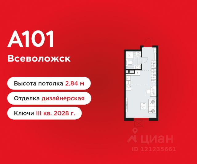 Студия площадью 20.60 в ЖК "А101 Всеволожск" c лоджией на 8 этаже. Квартира white box. Вид из окна во двор. В квартире 1 санузел. Высота потолков 2.8 м. Особенность планировки - гардеробная. ОТДЕЛКА Квартира с предчистовой отделкой предполагает: качественную стяжку на полах под финишное покрытие, потолок с обеспыливающей грунтовкой белого цвета, ровные стены с покрытием штукатурка. Выполнены все работы по проведению электрики. На все отделочные работы от застройщика предоставляется гарантия. Если вы хотите дозаказать дизайнерскую отделку, обращайтесь к нашими специалистами. ОСОБЕННОСТИ ПЛАНИРОВКИ Места для хранения находятся в прихожей и жилой зоне квартиры, дополнительно можно получить доступ к кладовым на подземном уровне (площадь - 2-8 кв. м). ПАРАДНАЯ В каждой парадной предусмотрены места для хранения велосипедов и колясок, гостевой санузел, лапамойка (место для мытья домашних животных или колес велосипедов) и удобная зона ожидания для гостей. ДВОРЫ И ОКРУЖЕНИЕ Просторные дворы свободны от машин и закрыты от посторонних. Большую часть комплекса займут благоустроенные зелёные зоны, теневые сады и городские общественные пространства с развитой тротуарной сетью и велодорожками. Каждый дом оборудован системами видеонаблюдения и контроля доступа. Не хватает средств на покупку кладового помещения? Оформите ипотеку на квартиру и добавьте к ней часть стоимости кладовой. ЗАСТРОЙЩИК ГК "А101" - крупный инвестиционно-строительный холдинг, занимает 6-е место по объему строительства в России (по данным "Единого ресурса застройщиков" на 2023 год). НКР присвоило ГК "А101" кредитный рейтинг A+.ru, подтверждая его надежность и финансовую устойчивость для завершения строительства ЖК. Продам квартиру-студию в ипотеку в Всеволожске.