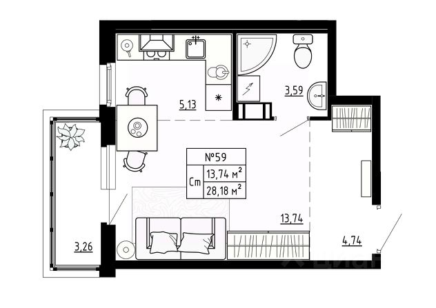 • 1,7 м² — балкон