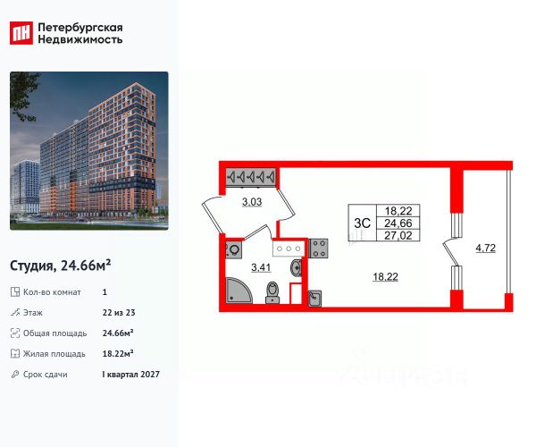 Общая площадь квартиры - 24.96 кв. м. , высота потолка 2,77 м.