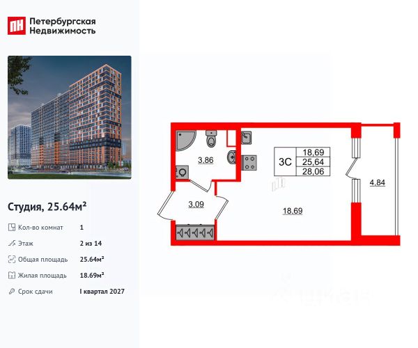 Продаётся квартира - студия от застройщика.