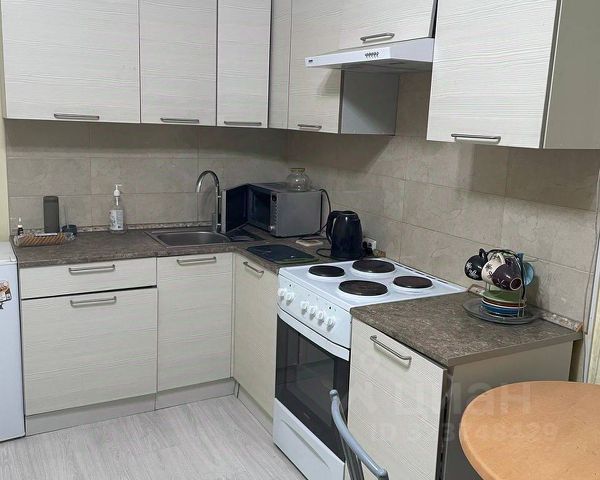 В квартире вместительный кухонный гарнитур, оснащен современной техникой: электроплита, духовой шкаф, вытяжка, холодильник.