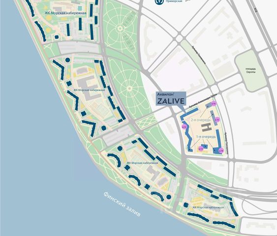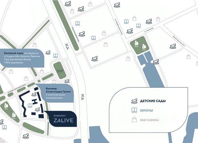 На территории "Аквилон ZALIVE" появится "зелёная набережная" (проект студии DEREVO PARK) - пешеходная аллея протяжённостью 300 метров с дизайнерским освещением и зонами отдыха, а также два "цветочных острова". Двор будет закрыт для машин, там установят детские площадки, спортивную зону workout и велопарковки.