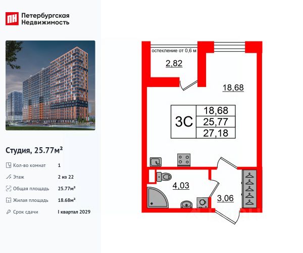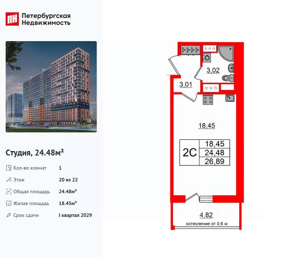 Общая площадь квартиры - 24.96 кв. м. , высота потолка 2,77 м.