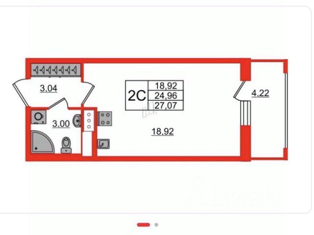 Комната 18.92 кв. м. , прихожая 3.04 кв. м. , санузел 3 кв. м.,