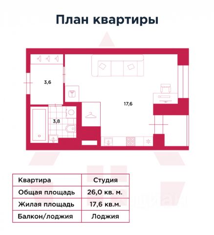 -Общая площадь - (26,5м2) с учетом огромного балкона - (5м2)
