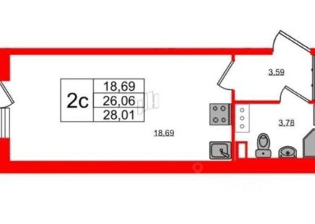 Потолки: высота - 2,7 м. Совмещенный санузел большой площади - 5,6 м, будет установлена ванная, не душевая кабина, что редкость для студии.