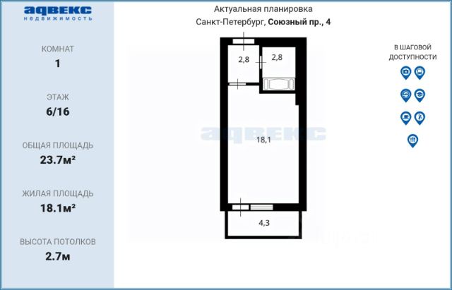 Здравствуйте, рад предложить к продаже теплую, уютную и светлую квартиру-студию в современном доме 2014 года постройки в Санкт-Петербурге. Квартира расположена на удобном 6 этаже и отлично подойдёт, как для собственного проживания, так и для сдачи в аренду.