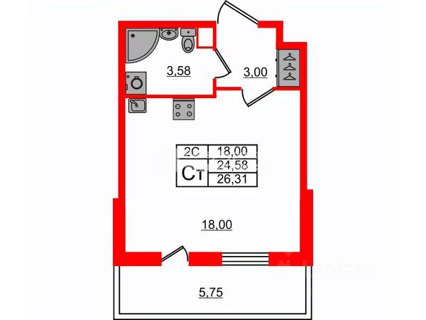 2. Апартаменты-студия площадью 29,2 м2. Фактически однокомнатная квартира, так как кухонная зона отделена от спальни шумоизолирующей перегородкой из стеклопакета. Совмещённый санузел с душевой кабиной. Балкона нет.