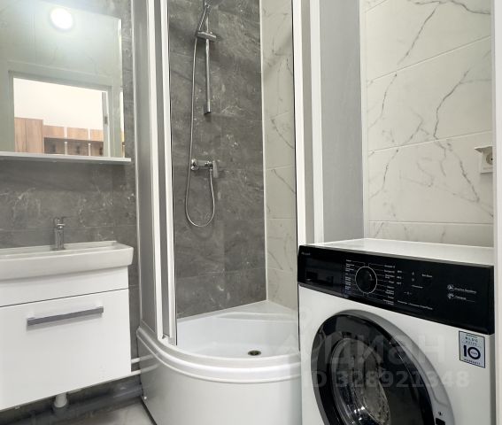 В совмещенном санузле (4,1 квадратных метра) установлена регулируемая система "теплый пол", душевая кабина, унитаз, раковина, полотенцесушитель, есть место для стиральной машинки, сушилки для белья и всевозможных шкафчиков. При желании можно заменить душевую кабину на ванну.