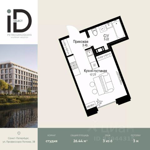 В продаже квартира в строящемся ЖК ID Рetrogradskаyа Комнат: студия Этаж: 4/6 Секция: С17 Площадь общая: 25,11 кв. м. Площадь жилая: 17,7 кв. м. Балкон: нет Номер: 493 Квартира передается без отделки, что позволяет воплотить свои дизайнерские идеи и создать уникальный интерьер. Во всех квартирах потолки 3 м и панорамные окна высотой 2,8 м. В каждой секции и на каждом этаже спроектированы помещения для установки кондиционеров. Предусмотрены грузовые лифты, на первых этажах организованы места для хранения детских колясок. Отделка входных групп и общих зон выполнена по авторскому дизайну. ______________________________________________ Срок сдачи 2029 г. Квартира продается по переуступке. Клубный квартал состоит из 29 секций в 6 этажей, располагается в Петроградском районе Санкт-Петербурга — между улицей профессора Попова и набережной реки Карповка. Одной из главных достопримечательностей выступает Иоанновский женский монастырь. Окна многих квартир выходят на живописную реку Карповку. Проектом предусмотрено благоустройство набережной, также застройщик отреставрирует артезианскую скважину императорских времён. Комплекс возводится в пешей доступности от трех станций метро — Петроградская, Чкаловская и Чёрная речка. В шаговой доступности находятся магазины, салоны красоты, медицинские центры, рестораны и сервисы. На территории запланирован детский сад на 100 мест и начальная школа на 200 мест. Проектом предусмотрен подземный паркинг, доступ в который осуществляется на лифте с жилых этажей. Гостевые парковки вынесены за периметр домов. Также на территории паркинга предусмотрены индивидуальные кладовые для хранения вещей жителей. Благодаря мосту Бетанкура и удобным выездам на главные транспортные магистрали (съезды на Уральскую улицу, набережную Макарова, ЗСД, Морскую набережную и проспект Кима), добраться до любой точки города и аэропорта Пулково комфортно и быстро.