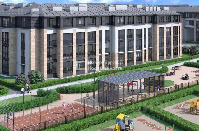 Двор свободен от машин, огорожен по периметру. Есть приватные патио, палисадники, зоны отдыха, детская площадка и спортивная зона.