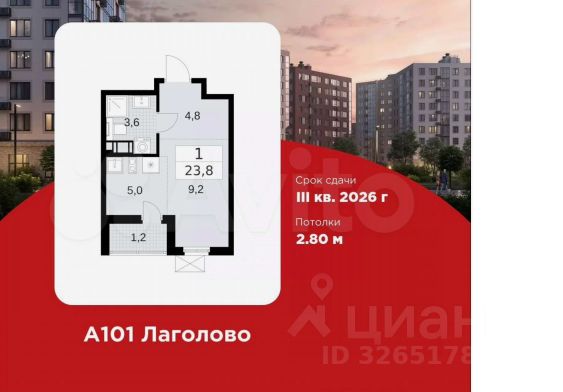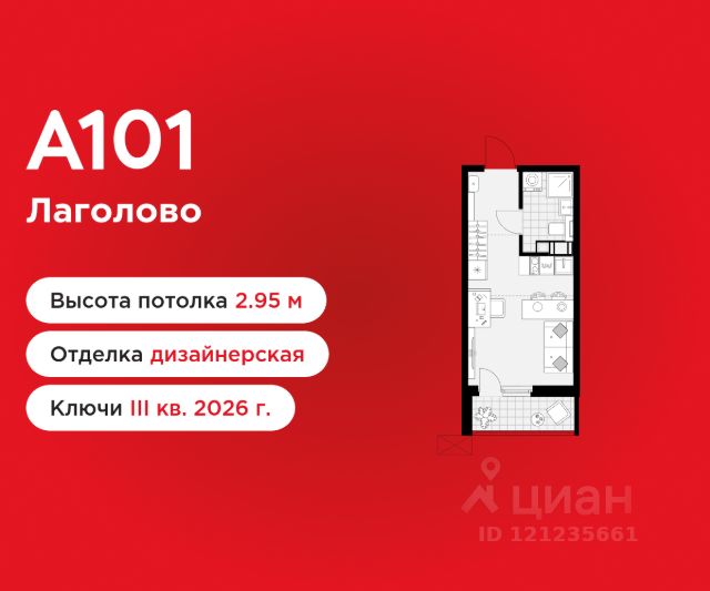 Старт продаж! Студия площадью 23.61 в ЖК "А101 Лаголово" на 5 этаже. Квартира без отделки. Вид из окна на улицу. В квартире 1 санузел. Высота потолков 2.74 м. Предложения от застройщика на февраль 2026: - Гибкая рассрочка 20 000 руб/мес. и первым взносом 10%. ОТДЕЛКА Квартира передается без отделки. Благодаря тому, что в данном типе отделки стены не возводятся, вы сможете создать удобную планировку и самостоятельно организовать зонирование комнат. ПАРАДНАЯ. В каждой парадной предусмотрены места для хранения велосипедов и колясок, гостевой санузел и удобная зона ожидания для гостей. ДВОРЫ И ОКРУЖЕНИЕ. Просторные дворы безопасны для детей, так как свободны от машин, закрыты от посторонних и постоянно находятся под видеонаблюдением. Во дворах создается разнообразная среда для детей всех возрастов: детские площадки с батутами, тактильными дорожками и игровыми комплексами. Для активного отдыха - воркаут-площадки, столы для пинг-понга и газоны для занятий йогой. Во дворах есть и тихие уголки - зеленые гостиные с уличной мебелью, где можно поработать на свежем воздухе или отдохнуть в тишине. Из внутренних дворов комплекса можно выйти на пешеходный бульвар длиной около 900 метров. Здесь будет организовано полноценное общественное пространство с амфитеатром, уличным кафе, ручьем, фонтаном и множеством мест для отдыха и игр. Большую часть бульвара займут благоустроенные зеленые зоны и теневые сады из десятков видов деревьев и кустарников, многолетних цветов и трав, которые будут радовать глаз круглый год. "А101 Лаголово" - современный город у подножия знаменитых Дудерговских высот, в объятиях чистейших озер и зеленых живописных массивов, наполненный всем необходимым для счастливой жизни. ИНФРАСТРУКТУРА. Мы занимаемся комплексным освоением территории. Наш приоритет - доступность всех сервисов для счастливой жизни. 1. Лаголово-город 15-ти минутной доступности. Вся необходимая инфраструктура: магазины, салоны красоты, образовательные учреждения, медицинские центры находятся в 15-ти минутах пешей прогулки от любой точки жилого комплекса. Это позволяет не тратить время на долгие перемещения. 2. Представьте идеальный город, где ребенок может спокойно играть, а пожилой человек наслаждаться заслуженным отдыхом. Жилая среда нашего комплекса может комфортно использоваться как 8-летним ребенком, так и 80-летним пожилым человеком. Дома, улицы, общественные пространства, тротуары спроектированы с заботой о людях разных возрастов. 3. Мы активно развиваем авторскую образовательную экосистему "Лёрнити". Она включает строительство 8 современных детских садов (2000 мест) и 3 школ (2945 учащихся). Мы учим родителей гармонично общаться с детьми, помогаем малышам подготовиться к школе, а подросткам - выбрать будущую профессию и развить таланты. Не хватает средств на покупку кладового помещения? Оформите ипотеку на квартиру и добавьте к ней часть стоимости кладовой. ЗАСТРОЙЩИК ГК "А101" - крупный инвестиционно-строительный холдинг, занимает 6-е место по объему стр