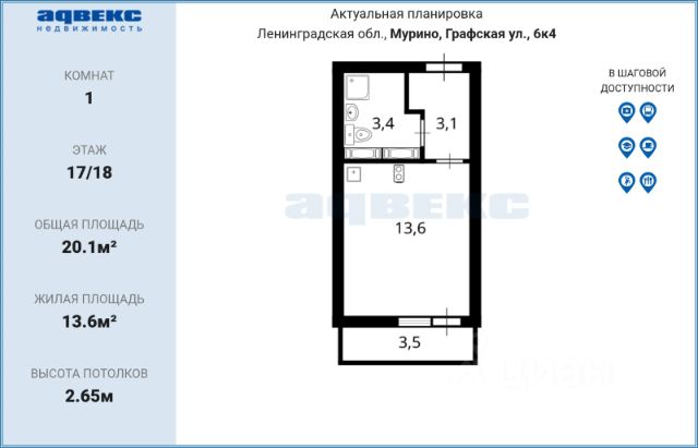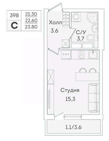 Цена актуальна при 100% оплате собственными средствами или любой ипотечной программе без субсидирования. В продаже от застройщика студия 22.6 кв. м с черновой отделкой и практичной планировкой для удобной организации пространства. Корпус сдан, идет выдача ключей. Мир может стремительно меняться, предлагая новые правила игры, удивительные цифровые технологии или скоротечные тренды, но одно остается неизменным — иногда нам необходимо спрятаться от мира и обрести чувство гармонии и уединения, нам важно видеть счастливые глаза любимых и знать, что у нас дома — безопасно, уютно и тепло. Жилой комплекс "Лампо" именно об этом. ЖК "Лампо" — современный проект комфорт-класса, построенный на пересечении Графской и Екатерининской улиц, в 15 минутах ходьбы от станции метро "Девяткино" в городе Мурино. Еще 20 минут по красной ветке — и вы в самом центре Петербурга. К удобству автомобилистов новая развязка КАД всего в паре кварталов от комплекса. Жилой комплекс "Лампо" — это 4 дома высотой от 16 до 19 этажей. Архитекторы спроектировали минималистичные фасады, лоджии и витражное остекление. В проекте представлены студии и квартиры с 1 и 2 комнатами, везде — застеклённые лоджии и комнаты правильной прямоугольной формы. Застройщик предлагает жилые помещения как с черновой, так и с предчистовой отделкой White Box. Проект "Лампо" приятно порадует будущих жильцов не только фасадами и практичностью планировок квартир, но и развитой инфраструктурой. В ЖК предусмотрен детский сад, благоустроенные дворы и подземный паркинг в каждом доме. Первые этажи отданы под коммерческое использование, где уже начинают открываться магазины и аптеки, салоны красоты и фитнес-залы, пункты выдачи заказов и зоомагазины, кафе и пекарни. Дома всегда будет свежий хлеб, а по утрам — ароматный кофе из любимой кофейни. В современном благоустроенном городе Мурино найдется всё для удобства жителей от магазинов и кофеен до фитнес-клубов, школ, детских садов и больниц. Проектное финансирование и контроль за строительством осуществлял АО "Банк ДОМ.РФ". Квартира-студия на улице Графская в городе Мурино.