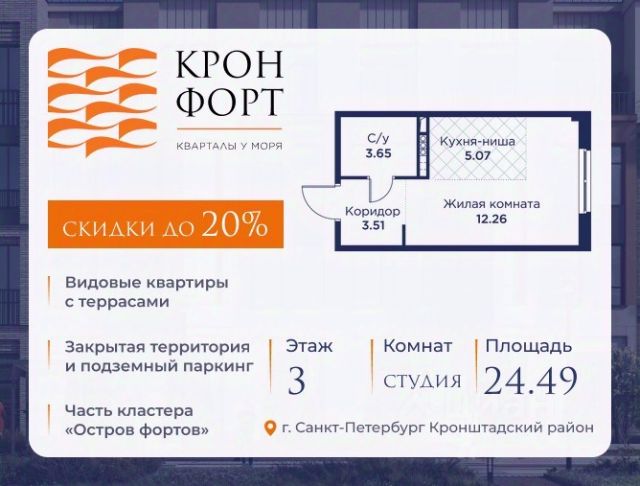 Стоимость квартиры указана со скидкой 20%. Скидка предоставляется при 100% оплате или несубсидированной ипотеке. Предлагается квартира площадью 26.14 кв.м в жилом комплексе "Кронфорт. Центральный" в Санкт-Петербурге (Кронштадт). Возможна покупка с использованием льготных и специальных ипотечных программ с государственной поддержкой. Высота потолков в квартирах — от 3 до 3,4 метров, окна увеличенного размера, есть варианты с эркерами, французскими балконами, лоджиями и террасами. Жилой квартал состоит из пяти четырехэтажных корпусов с закрытыми охраняемыми дворами, свободными от машин. Первые этажи формируют торговые променады в стиле пешеходных улиц исторической части Петербурга и Кронштадта. Внутренние пространства между корпусами — пешеходные зоны с уютными площадями. Архитектурный облик квартала разработан бюро "Проектная культура" и международной компанией Chapman Taylor. Инфраструктура комплекса включает: - Лицей с двумя бассейнами - Детский сад на 150 мест с бассейном и закрытой территорией - Веревочный парк - Игровые площадки для активного отдыха; - Кабинет врача общей практики. - Подземные паркинги с лифтами. - Мусоросборные камеры, индивидуальные кладовые. - Закрытые дворы с контролем доступа и видеонаблюдением. - Мультформатный стрит-ретейл с кафе и ресторанами. - Триатлон-центр и беговые/велодорожки. - Учебно-тренировочный комплекс для детей "Лагерь настоящих героев". Транспортная доступность обеспечивает удобный выезд на КАД (около 1-3 км), 2 минуты пешком до автобусной остановки "Лицей", 25 минут до Сестрорецка, 30 минут до "Лахта-центра", 50 минут до аэропорта "Пулково" и 60 минут до Московского вокзала. Для любителей моря доступен маршрут на "Метеоре" до центра Санкт-Петербурга. Отделка квартир предлагается как с готовой чистовой отделкой, так и со свободной планировкой без отделки для реализации индивидуальных дизайнерских решений. В третьем корпусе, продажи которого стартовали в марте 2025 года, доступны квартиры с просторными террасами, тремя балконами, кухнями-гостиными до 38 кв.м с окнами на две стороны, обеспечивающими панорамное освещение и виды. Если вам нужна помощь с оформлением ипотеки или дополнительная информация по комплексу и условиям покупки, обращайтесь в отдел продаж за консультацией.