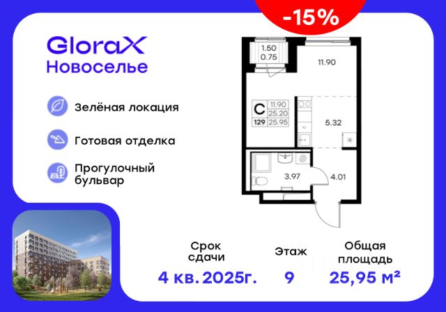 Продается квартира-студия на 9-м этаже в строящемся проекте комфорт-класса GloraX Новоселье. Общая площадь лота составляет 25,95 кв. м, из которых 11,90 кв. м отведено под жилую и 5,32 кв. м под кухонную зону. Номер квартиры - 129 Преимущества квартиры: - Квартиры комфорт-класса с чистовой отделкой в двух цветовых гаммах на выбор - Зеленый район, 5 мин. до Гореловсого лесопарки, 10 мин. до Шунгеровского заказника - 7 мин. до КАД, 16 мин. до ЗСД - 864 м/м на открытой стоянке - Благоустроенный собственный прогулочный бульвар - Закрытые дворы с видеонаблюдением - Детские площадки с геопласткой и бизиборадми - Сад и школа в шаговой доступности - Спортивные площадки и вело-дорожки - Коммерческие помещения на 1 этажах GloraX Новоселье — новый проект комфорт-класса на юго-западной границе Санкт-Петербурга и Ленинградской области. Близость к зеленым зонам Гореловского лесопарка и природного Шунгеровского заказника, а также пешеходный многофункциональный бульвар в центре квартала — идеальное место для тех, кто ценит природу и тишину, при этом не готов отказываться от благ современной инфраструктуры. Застройка осуществляется в рамках единой концепции, предусматривающей не только создание комфортного жилья, но и формирование собственной внутренней благоустроенной среды. Территория каждого двора разделена на зоны отдыха, досуга и игровые площадки с учетом возраста и потребностей детей и взрослых создает неповторимую атмосферу, заряжающую энергией на новые свершения. Это проект, в котором спокойно во всех отношениях. Живите на природе, но с комфортом мегаполиса. Проведите теплые дни в Гореловском лесопарке. Познакомьте детей с историей в Стрельне, Петергофе или Красном селе. Они расположены в 30 минутах от проекта. До ж/д станции "Сергиево" 11 минут на автомобиле, до метро Проспект Ветеранов 20 минут, КАД 7 минут, ЗСД 16 минут. В шаговой доступности остановка общественного транспорта. Рядом с проектом будут построены школа и детский сад. Здесь все создано для максимального комфорта каждого жителя. Приватное пространство внутреннего двора с беседками для работы и отдыха, зеленый двор с уютным многоуровневым освещением, детскими эко-площадками и спортивными workout создает неповторимую атмосферу, заряжающую энергией на новые свершения. Цена указана при 100% оплате или стандартной ипотеке. Узнайте подробности в Отделе продаж.