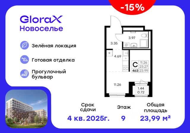 Продается квартира-студия на 9-м этаже в строящемся проекте комфорт-класса GloraX Новоселье. Общая площадь лота составляет 23,99 кв. м, из которых 11,26 кв. м отведено под жилую и 4,69 кв. м под кухонную зону. Номер квартиры - 463 Преимущества квартиры: - Квартиры комфорт-класса с чистовой отделкой в двух цветовых гаммах на выбор - Зеленый район, 5 мин. до Гореловсого лесопарки, 10 мин. до Шунгеровского заказника - 7 мин. до КАД, 16 мин. до ЗСД - 864 м/м на открытой стоянке - Благоустроенный собственный прогулочный бульвар - Закрытые дворы с видеонаблюдением - Детские площадки с геопласткой и бизиборадми - Сад и школа в шаговой доступности - Спортивные площадки и вело-дорожки - Коммерческие помещения на 1 этажах GloraX Новоселье — новый проект комфорт-класса на юго-западной границе Санкт-Петербурга и Ленинградской области. Близость к зеленым зонам Гореловского лесопарка и природного Шунгеровского заказника, а также пешеходный многофункциональный бульвар в центре квартала — идеальное место для тех, кто ценит природу и тишину, при этом не готов отказываться от благ современной инфраструктуры. Застройка осуществляется в рамках единой концепции, предусматривающей не только создание комфортного жилья, но и формирование собственной внутренней благоустроенной среды. Территория каждого двора разделена на зоны отдыха, досуга и игровые площадки с учетом возраста и потребностей детей и взрослых создает неповторимую атмосферу, заряжающую энергией на новые свершения. Это проект, в котором спокойно во всех отношениях. Живите на природе, но с комфортом мегаполиса. Проведите теплые дни в Гореловском лесопарке. Познакомьте детей с историей в Стрельне, Петергофе или Красном селе. Они расположены в 30 минутах от проекта. До ж/д станции "Сергиево" 11 минут на автомобиле, до метро Проспект Ветеранов 20 минут, КАД 7 минут, ЗСД 16 минут. В шаговой доступности остановка общественного транспорта. Рядом с проектом будут построены школа и детский сад. Здесь все создано для максимального комфорта каждого жителя. Приватное пространство внутреннего двора с беседками для работы и отдыха, зеленый двор с уютным многоуровневым освещением, детскими эко-площадками и спортивными workout создает неповторимую атмосферу, заряжающую энергией на новые свершения. Цена указана при 100% оплате или стандартной ипотеке. Узнайте подробности в Отделе продаж.