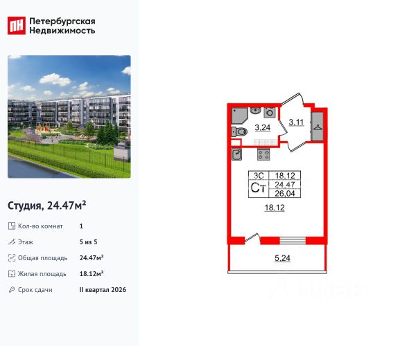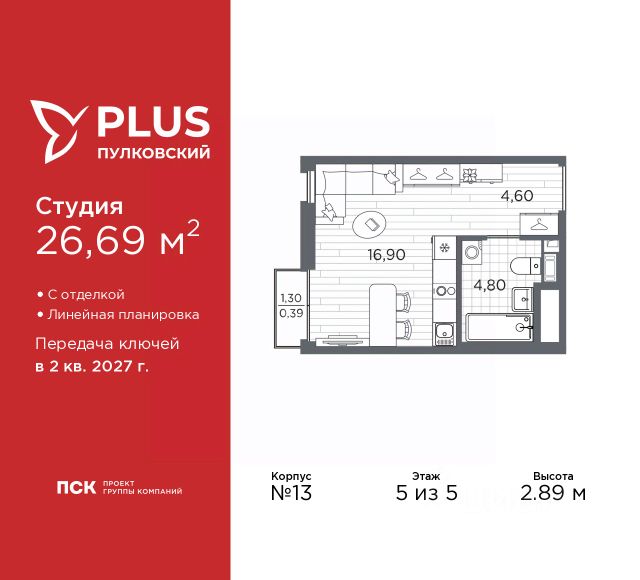 Продается 1-комн. квартира-студия от застройщика с отделкой в ЖК "PLUS Пулковский" на 5 этаже. Общая площадь: 20.5 кв.м., площадь гостиной 13.7 кв.м., из которых 5 кв.м. выделено под кухонную зону. Все окна выходят на одну сторону. В квартире один совмещенный санузел. Высота потолков 2.89 м. Дом монолитный, трехподъездный, высотой 5 этажей. Квартира находится в 3-й секции в корпусе 13. На этаже 6 квартир. В подъезде 1 грузовой лифт. Начало строительства - 1 квартал 2026 года. Окончание строительства - 2 квартал 2027 года. Оформление сделки по договору долевого участия. ЖК "PLUS Пулковский" расположен в престижном Московском районе на пересечении Пулковского и Волхонского шоссе, по которым можно быстро добраться до КАД и до станций метро Московская и Звёздная. Поблизости расположены дворцово-парковые ансамбли Пушкина, Павловска, Петергофа, Гатчины, Ломоносова, а также вся торговая и развлекательная инфраструктура: ТК Лето, Outlet Village Pulkovo, Пулково-3, гипермаркеты Лента, Окей, Metro. На территории комплекса будут построены средняя образовательная школа на 825 мест с двумя бассейнами, 2 детских сада на 220 мест каждый. В детских садах тоже будут бассейны. Кроме этого будет построен медицинский центр для взрослых и детей. Во дворах буду оборудованы спортивные и безопасные детские площадки, на первых этажах домов будут расположены коммерческие помещения. Для автолюбителей будут подземные и наземный паркинги. Для жителей домов будет доступно "приложение жителя", которое предоставит такие возможности: — дистанционное открытие дверей в парадную и на территорию комплекса, — просмотр изображений с видеокамер, — контроль за показаниями счетчиков, — коммуникация с УК. Показания всех счетчиков будут собираться дистанционно. В квартирах будет выполнена коллекторная разводка отопления в стяжке пола от коллекторов в межквартирных коридорах. Застройщик ЖК "PLUS Пулковский" - группа компаний ПСК, которая является одной из ведущих девелоперских компаний Санкт Петербурга. Более 16 лет она возводит в Северной столице качественное жилье премиум, бизнес и комфорт-класса, социальные объекты школы и детские сады, апарт-комплексы и торговые центры и является четырехкратным обладателем золотого знака "Надежный застройщик России". #Z6f33v