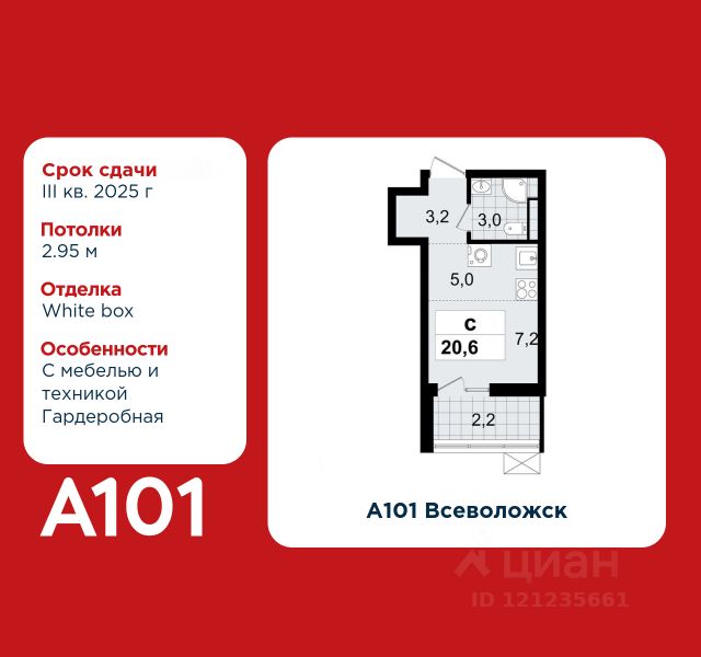Старт продаж Студия площадью 25.20 в ЖК "А101 Всеволожск" на 9 этаже. Квартира с отделкой. Вид из окна во двор. В квартире 1 санузел. Высота потолков 2.84 м. Предложения от застройщика на декабрь 2025: - Гибкая рассрочка 20 000 руб/мес. и первым взносом 10%. ОТДЕЛКА Для квартир с чистовой отделкой предлагается три варианта дизайна: Классика, Карелия светлая и Карелия темная. Варианты всех дизайнерских решений представлены на фотографиях. Подробности можно уточнить у менеджера. На все отделочные работы от застройщика предоставляется гарантия. ПАРАДНАЯ В каждой парадной предусмотрены места для хранения велосипедов и колясок, гостевой санузел, лапамойка (место для мытья домашних животных или колес велосипедов) и удобная зона ожидания для гостей. ДВОРЫ И ОКРУЖЕНИЕ Просторные дворы свободны от машин и закрыты от посторонних. Большую часть комплекса займут благоустроенные зелёные зоны, теневые сады и городские общественные пространства с развитой тротуарной сетью и велодорожками. Каждый дом оборудован системами видеонаблюдения и контроля доступа. Не хватает средств на покупку кладового помещения? Оформите ипотеку на квартиру и добавьте к ней часть стоимости кладовой. ЗАСТРОЙЩИК ГК "А101" - крупный инвестиционно-строительный холдинг, занимает 6-е место по объему строительства в России (по данным "Единого ресурса застройщиков" на 2023 год). НКР присвоило ГК "А101" кредитный рейтинг A+.ru, подтверждая его надежность и финансовую устойчивость для завершения строительства ЖК.