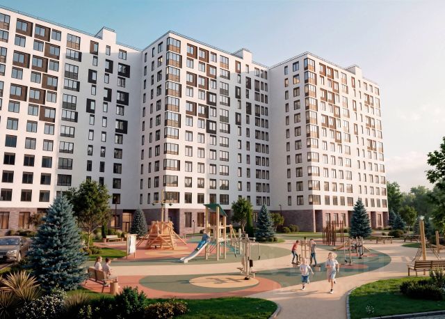 В состав жилого комплекса "Ювента" входит три здания комфорт-класса высотой 6, 9 и 11 этажей с яркими разноцветными фасадами, а также пристроенный корпус детского сада на 80 малышей.