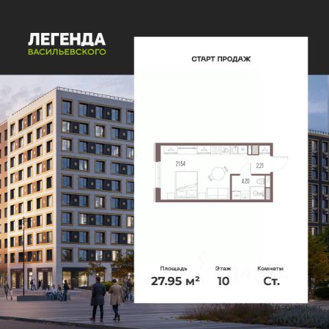 Просторная 1-комн. квартира-студия с предчистовой отделкой в ЖК "ЛЕГЕНДА Васильевского" на 10 этаже. Общая площадь: 30.7 кв.м., площадь гостиной 19.13 кв.м., из которых 5 кв.м. выделено под кухонную зону. Все окна выходят на одну сторону. В квартире один совмещенный санузел. Высота потолков 2.72 м. "ЛЕГЕНДА Васильевского" жилой квартал в минутной доступности от Финского залива, главного креативного хаба Санкт-Петербурга Севкабель Порта и других точек притяжения. Современные инженерные и технические решения, повышающие качество жизни TechnoBox включают в себя: стационарный и удаленный контроль дома, систему вентиляции Air Design - здоровое дыхание без лишнего шума, мультисервисную сеть, объединяющую коммуникационные системы, удаленное управление электроприборами, контроль отопления в каждом помещении, поддерживающий оптимальный температурный баланс во время "холодного" периода", датчики протечки, датчик открытия входной двери. Мультисервисная сеть (МСС) объединяет ключевые слаботочные системы дома, задавая им единый высокий стандарт работы, обеспечивая надёжность их функционирования и управления. Квартира готова к декорированию. Застройщиком сделана шумоизоляция; стены подготовлены для отделки; проведена электрика с учетом рекомендаций по расстановке мебели и бытовой техники; выровнен пол. В каждой квартире установлена взломостойкая входная дверь, окна со специальным термоизолированным алюминиевым профилем. Двор жилого комплекса "ЛЕГЕНДА Васильевского" закрыт. Проект состоит из шести разноформатных корпусов с ритмичными фасадами в духе пост-конструктивизма. Геометрия жилого комплекса состоит из четко простроенных осей, чередующих открытые пространства и объемы корпусов, каждый из которых обладает своим визуальным кодом индивидуальным рисунком фасада и цветовой палитрой. Корпуса образуют периметр с общественными пространствами: площадью с кафе, магазинами и пешеходным променадом с детскими игровыми хабами, местами для спокойного отдыха и workout-зоной. На территории комплекса предусмотрены теплый подземный паркинг и два наземных 4-х этажных паркинга.
