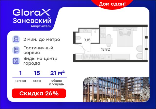 Продается апартамент-студия на 15-м этаже в сданном Апарт-комплексе бизнес-класса "GloraX Заневский". Ключи сразу! Общая площадь лота составляет 29,94 кв. м, из которых 25,01 кв. м отведено под жилую. Номер апартамента - 1 539. Преимущества: - Полная чистовая отделка - Возможность покупки меблировка и техника - Вход по ключ-карте - Прачечная на 1 этаже - Возможность дозаказа отельного сервиса - Программы доходности - Летний бар и променад - Воркаут площадка - Pet-friendly Апартаменты "GloraX Заневский" - проект бизнес-класса с развитой инфраструктурой, удовлетворяющей все потребности самых взыскательных гостей. Располагается в одном из наиболее перспективных, районов Петербурга в 2х минутах от метро "Ладожская" и в 10 минутах от Невского проспекта. В "GloraX Заневский" есть все, что необходимо для комфортной жизни, работы и отдыха. Инфраструктура, покрывающая все потребности и ожидания собственников и арендаторов. В радиусе 150 метров находятся супермаркеты с возможностью доставки продуктов прямо до дверей апартаментов. На 1000 кв. м. общественных пространств расположится уютный лобби-бар, ресторан мировой кухни на 80 человек и оборудованные коворкинги. В апартаментах "GloraX Заневский" выполнена современная отделка с использованием высококачественных экологичных материалов. В проекте предусмотрен подземный отапливаемый паркинг на 100 мест, куда можно спуститься на лифте прямо от дверей апартаментов. Узнайте подробности в Отделе продаж.