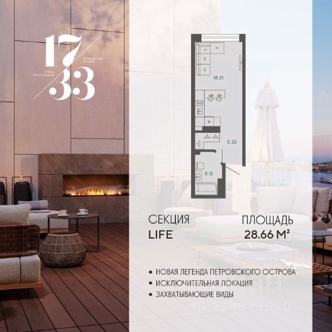 Продаётся студия в ЖК "Нева Резиденс" на 8 этаже. Общая площадь составляет 27.50 кв. м. Квартира без отделки. Жилой комплекс "Нева Резиденс" располагается по адресу Санкт-Петербург, Петроградский. Нева Резиденс - премиальный проект в центре Санкт-Петербурга, расположен в живописной локации с европейской атмосферой и собственной благоустроенной набережной. Расположение: • 1 минута пешком до Петровского пруда и сквера; • 3 мин на авто до Крестовского острова; • 8 мин на авто до станции метро "Чкаловская"; • 8 мин на авто до станции метро "Крестовский остров"; • 9 мин на авто до ЗСД; • 10 мин на авто до Стрелки В.О. и исторического центра города; • 24 мин на авто до Невского проспекта. Внутренняя территория комплекса полностью пешеходная, уютное пространство для отдыха детей и взрослых - большое внимание уделено ландшафтному дизайну, проработке пеших маршрутов, оформлению тематических зон. Местом прогулок жителей комплекса станет благоустроенная набережная, исполненная по уникальному проекту с озеленением и устройством малых архитектурных форм. Дизайн дворов предполагает создание искусственных холмов, высадку кустарников, цветников, крупномерных деревьев. Рядом расположился живописный Петровский парк с прудом. В нескольких минутах езды Петроградская сторона и исторический центр, через мост - Крестовский остров с огромной парковой зоной и аттракционами. Из подземного паркинга на лифте можно подняться на нужный этаж прямо к дверям квартиры. Преимущества: • Широкие окна, от 3м; • Фильтры тонкой очистки воды; • Система "Умный дом"; • Сквозные парадные с выходом во двор, безбарьерная среда; • 5-ти ступенчатая система очистки воды; • Повышенная звукоизоляция между квартирами; • Балконы и лоджии с теплым остеклением. Успейте приобрести квартиру на выгодных условиях! Чтобы узнать подробности, обращайтесь за консультацией по телефону.